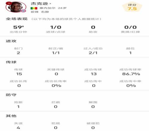 杰克逊数据:出场59分钟,2次射门就打入1球