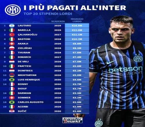 德国转会市场统计了国米球员的税前年薪列出榜单的,劳塔罗1660万欧居首的,巴雷拉、恰尔汗奥卢二三位的。